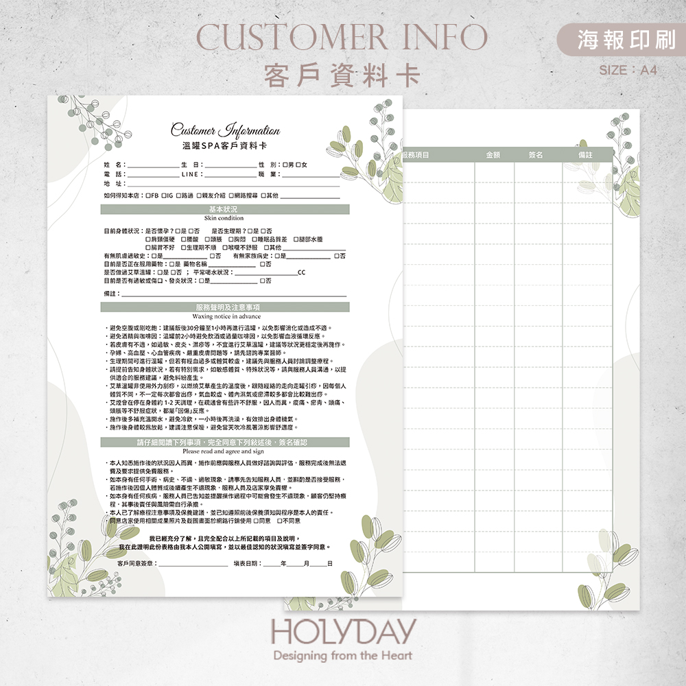 店家良伴!CI36 艾草溫罐顧客資料卡.A4雙面印刷.開店必備.美業.身心療癒.肩頸放鬆.舒緩疲勞.暖宮調理.按摩SPA.顧客卡.同意書.諮詢卡.評估卡┊HOLYDAY